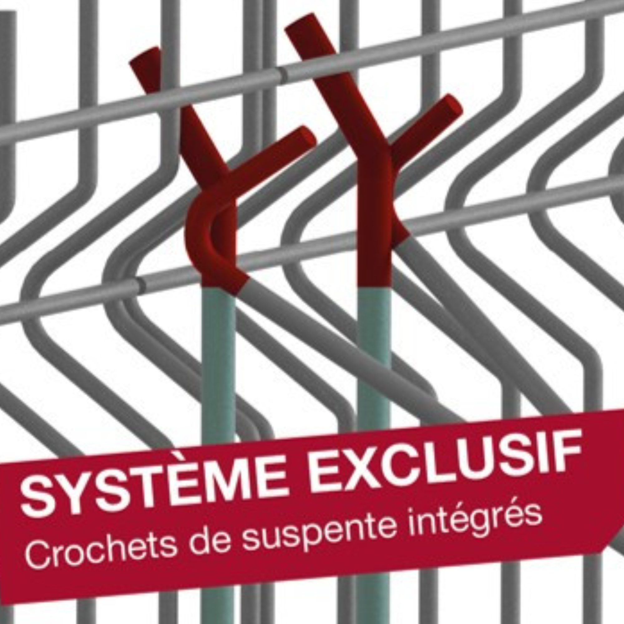 Pose rapide en comparaison à la moyenne des systèmes traditionnels du marché : • Des crochets de suspente qui permettent aux panneaux d’être autoportés • Des clips qui se fixent en moins de 2 secondes à l’aide d’une sertisseuse • Un seul poseur suffit pour installer la clôture